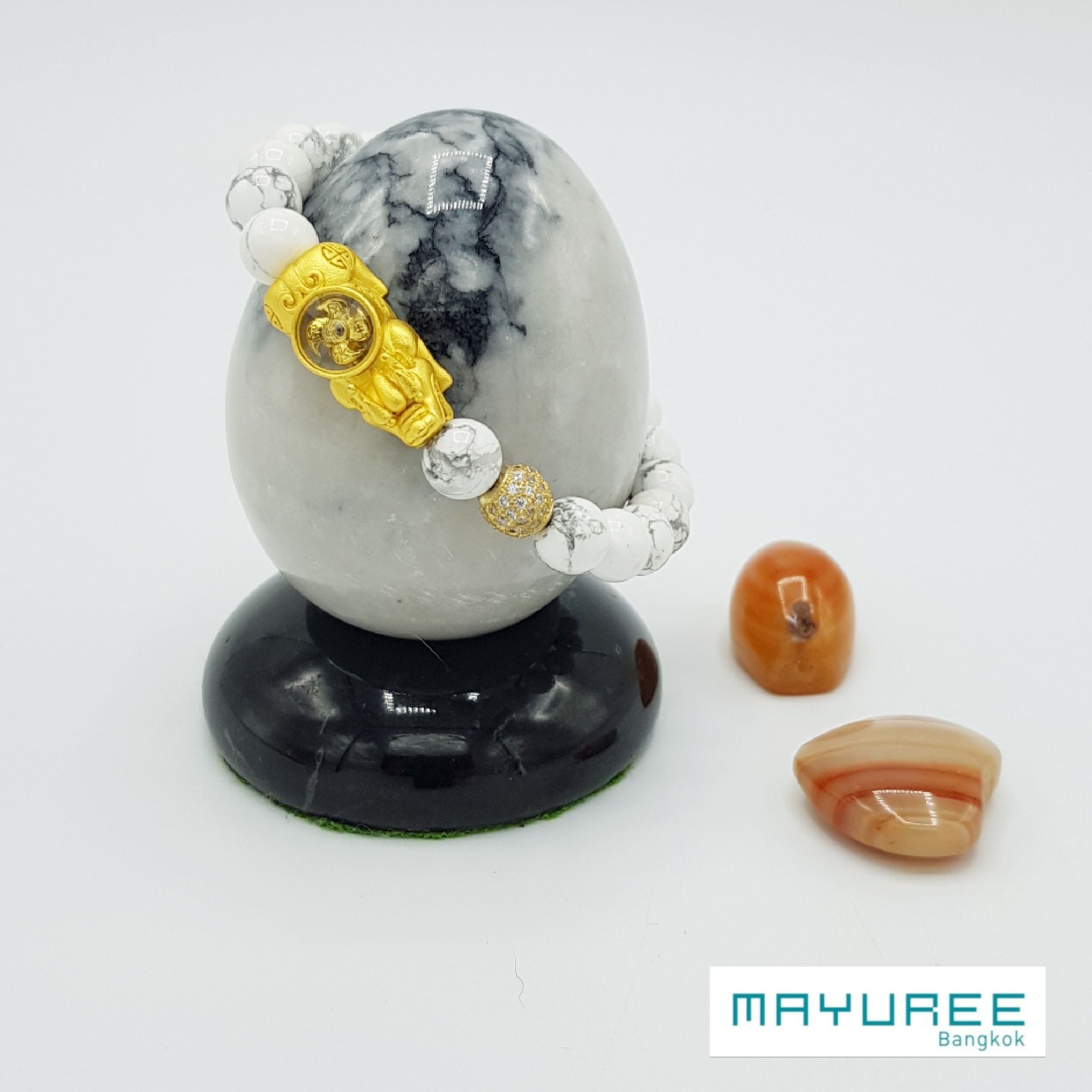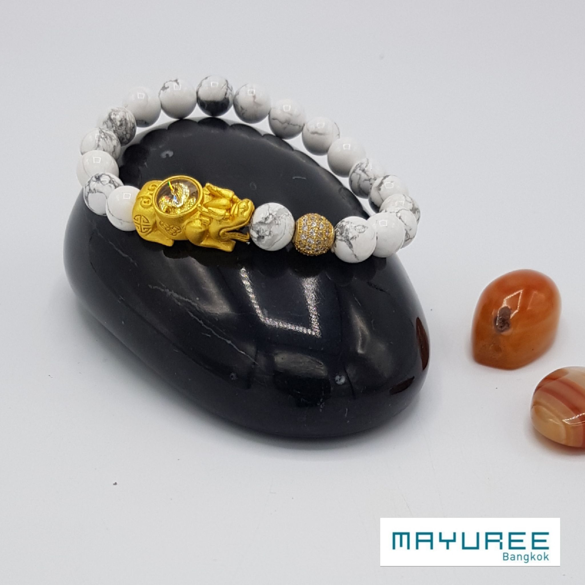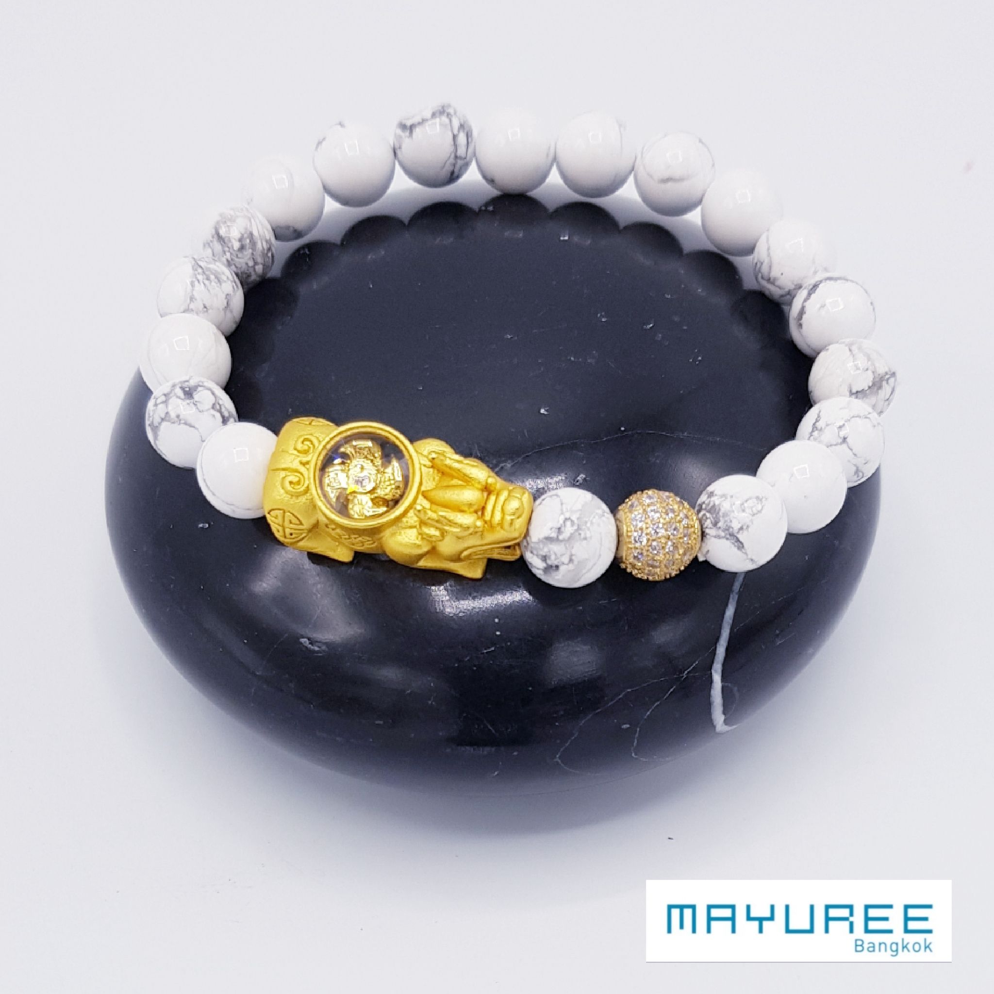 Howlite Beaded Bracelet, 8mm, Golden Windmill Pixiu, Artificial Diamond Beads